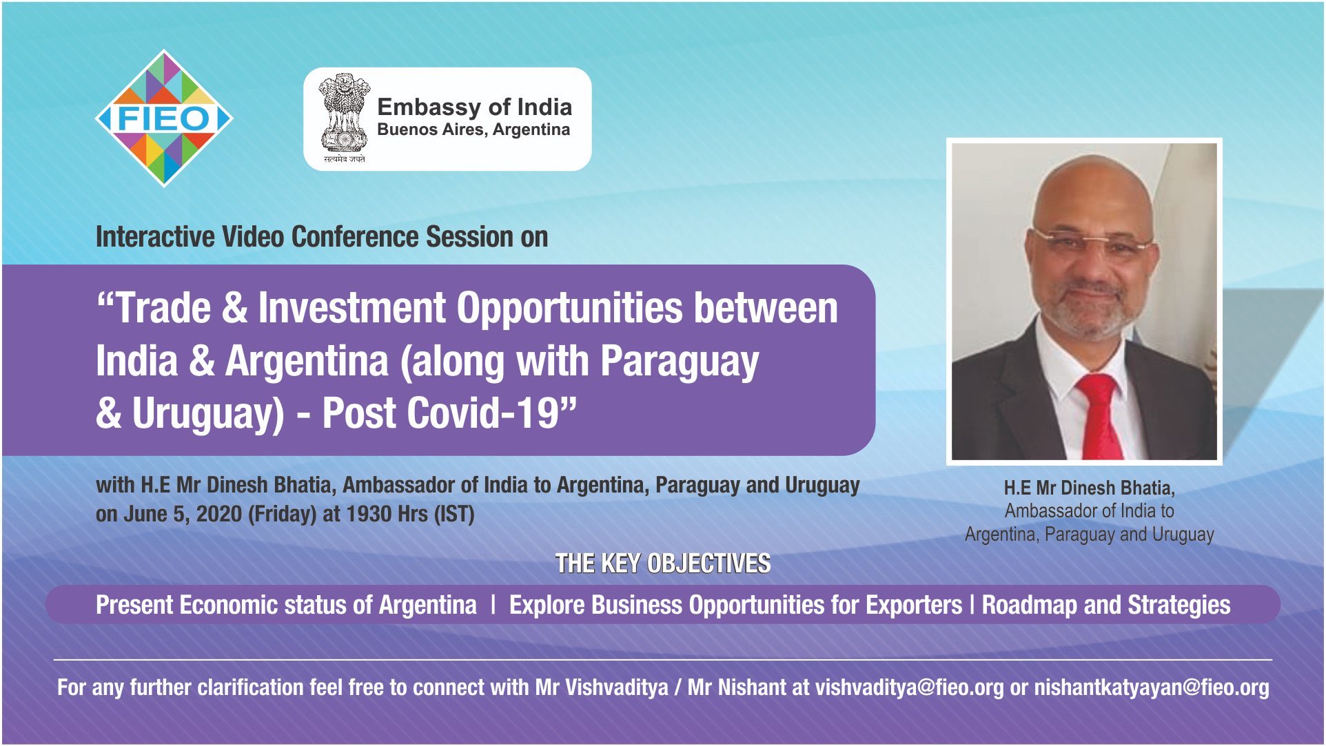 While COVID-19 lockdown is still continuing, there is a renewed emphasis on boosting economic ties. Ambassador Dinesh Bhatia addressed over 130 exporters and companies from India over a video conference hosted by Federation of Indian Export Organizations and briefed them about opportunities of trade with Argentina, Uruguay and Paraguay.