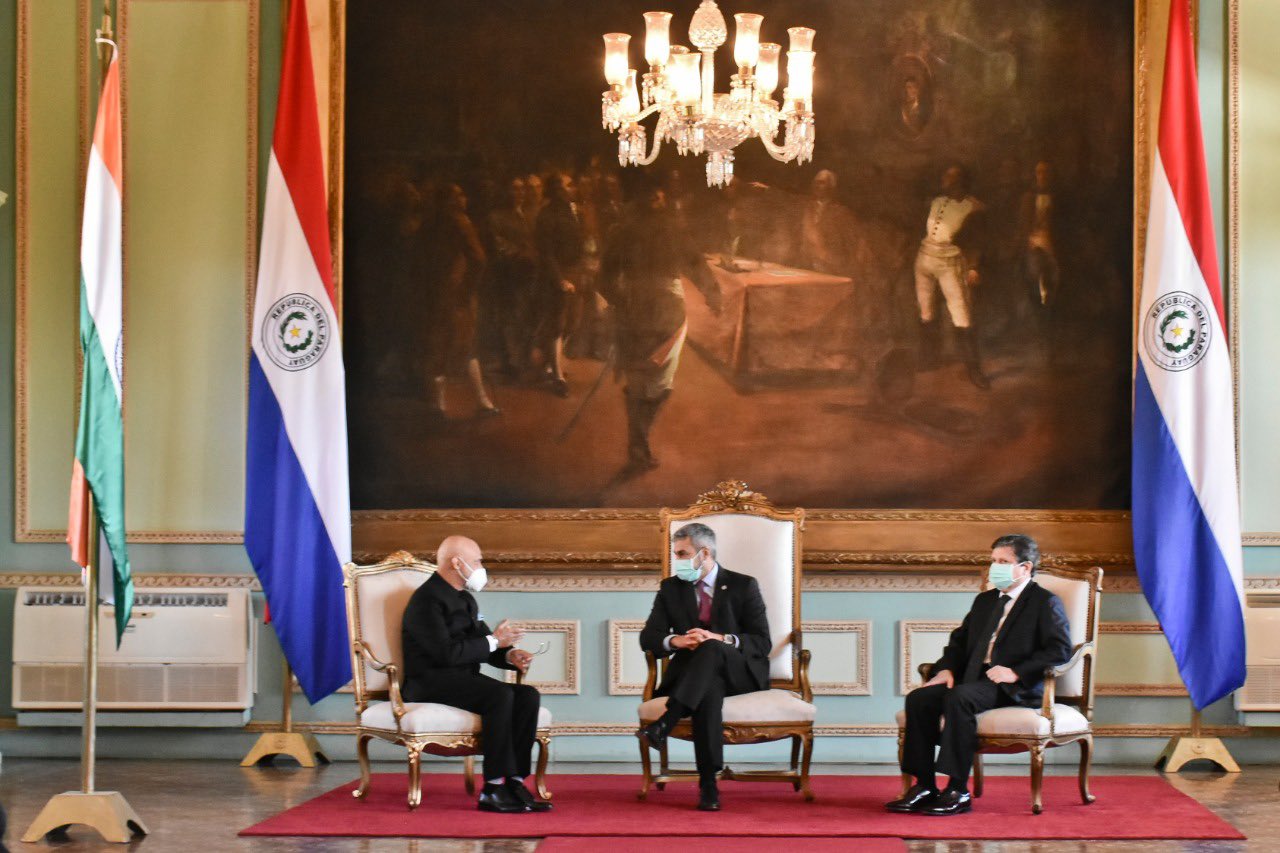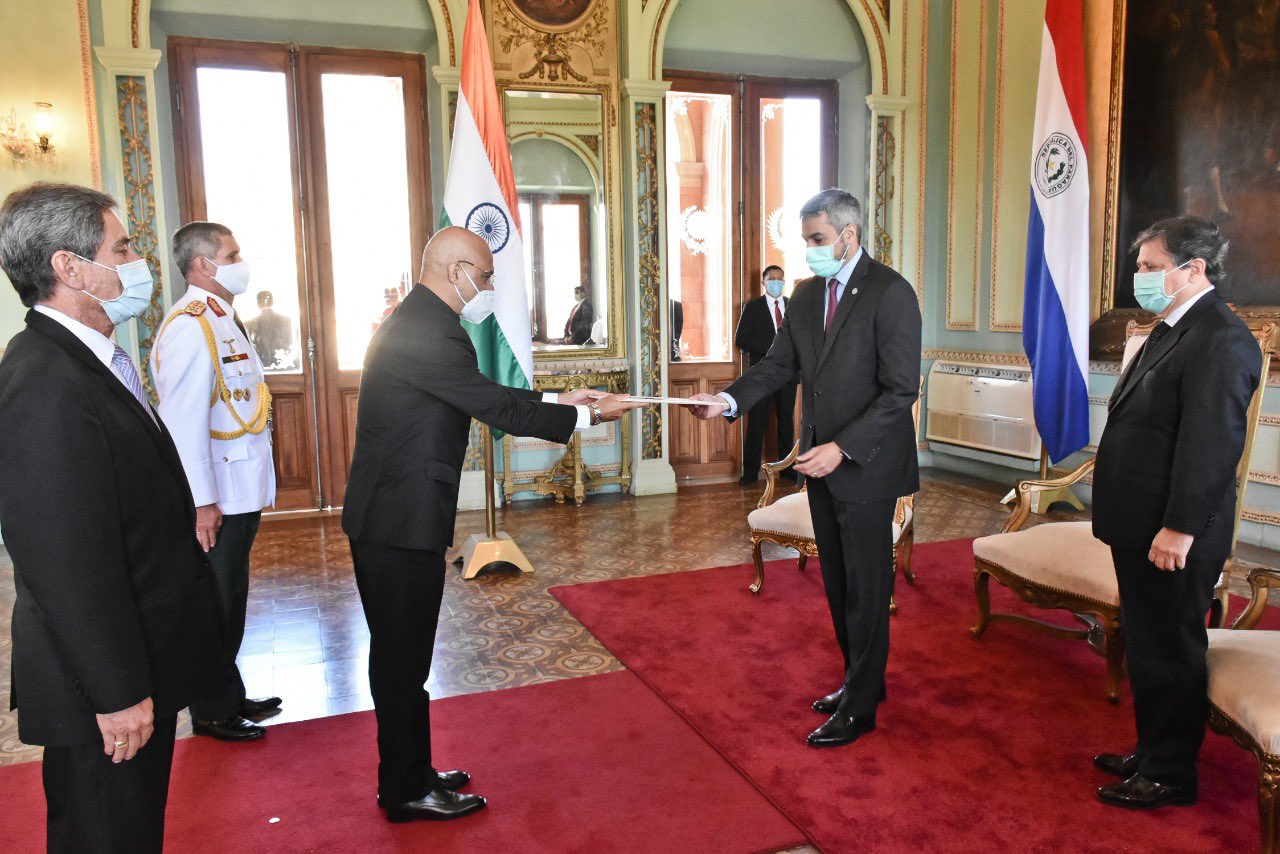 Ambassador Dinesh Bhatia presented credentials to President Mario Abdo at Presidencia Paraguay in an exceptional ceremony for a non-resident Ambassador to Paraguay. Conveying greetings from Rashtrapati Bhavan and Narendra Modi, he discussed deepening of bilateral relations between India and Paraguay.