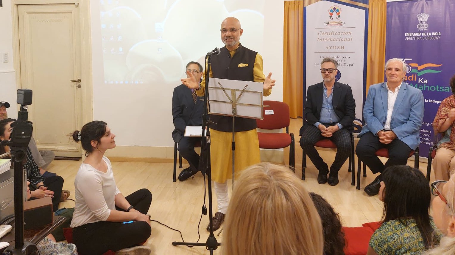 Ambassador Dinesh Bhatia together with Vaidya Rajesh Kotecha, Secretary of Ministry of AYUSH launched certified courses for yoga teachers & professionals at Hastinapura Foundation Argentina
