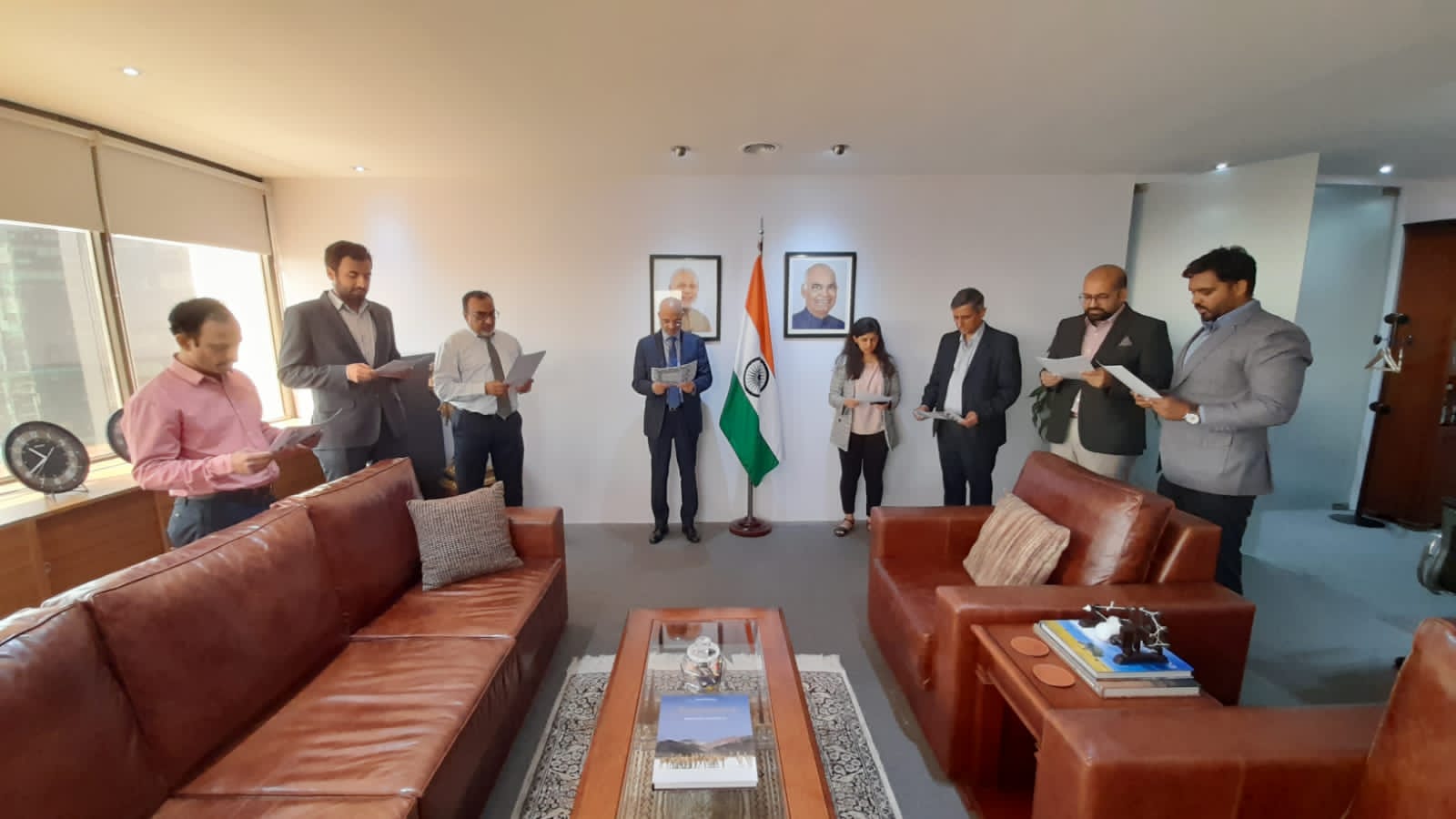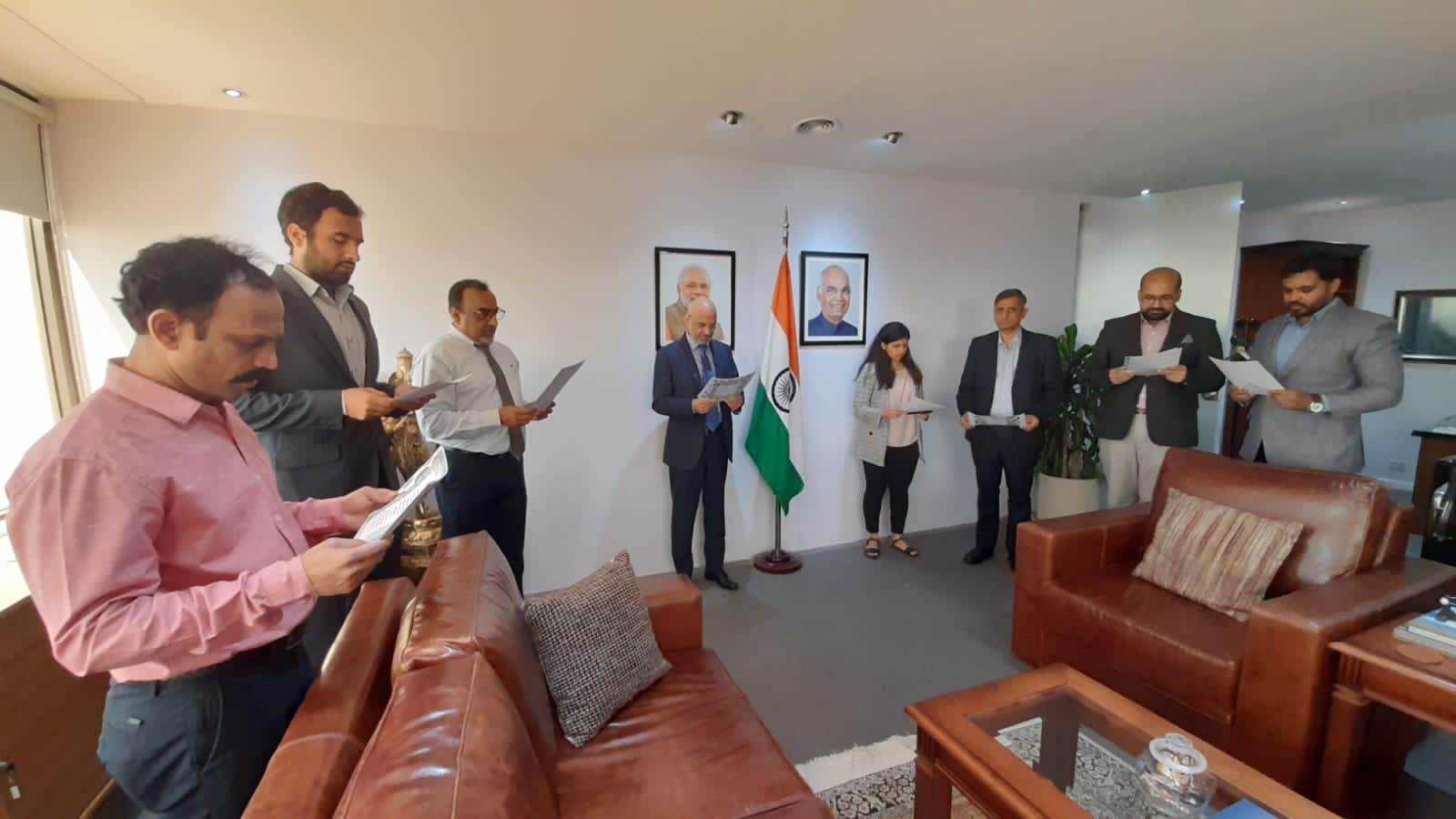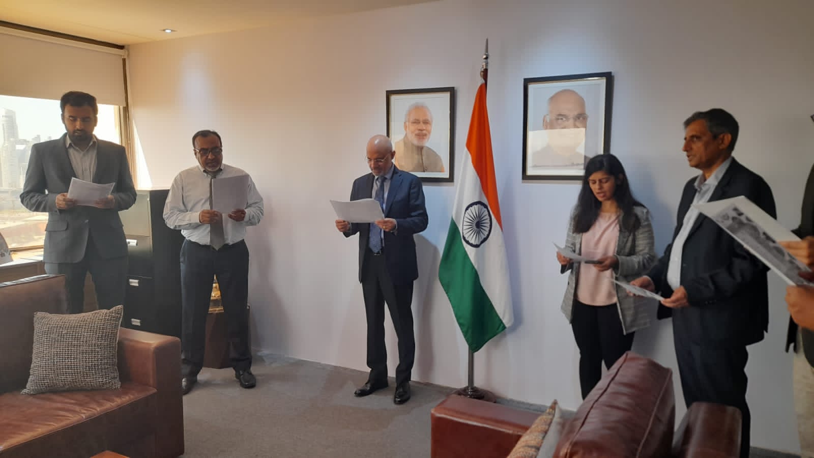 Ambassador Dinesh Bhatia along with Embassy officials read the #Preamble on #ConstitutionDay2021 & reaffirmed commitment to ideals of justice, liberty, equality & fraternity enshrined in the Indian Constitution.