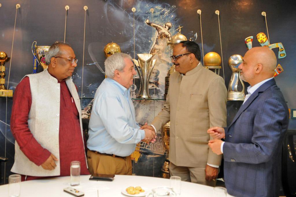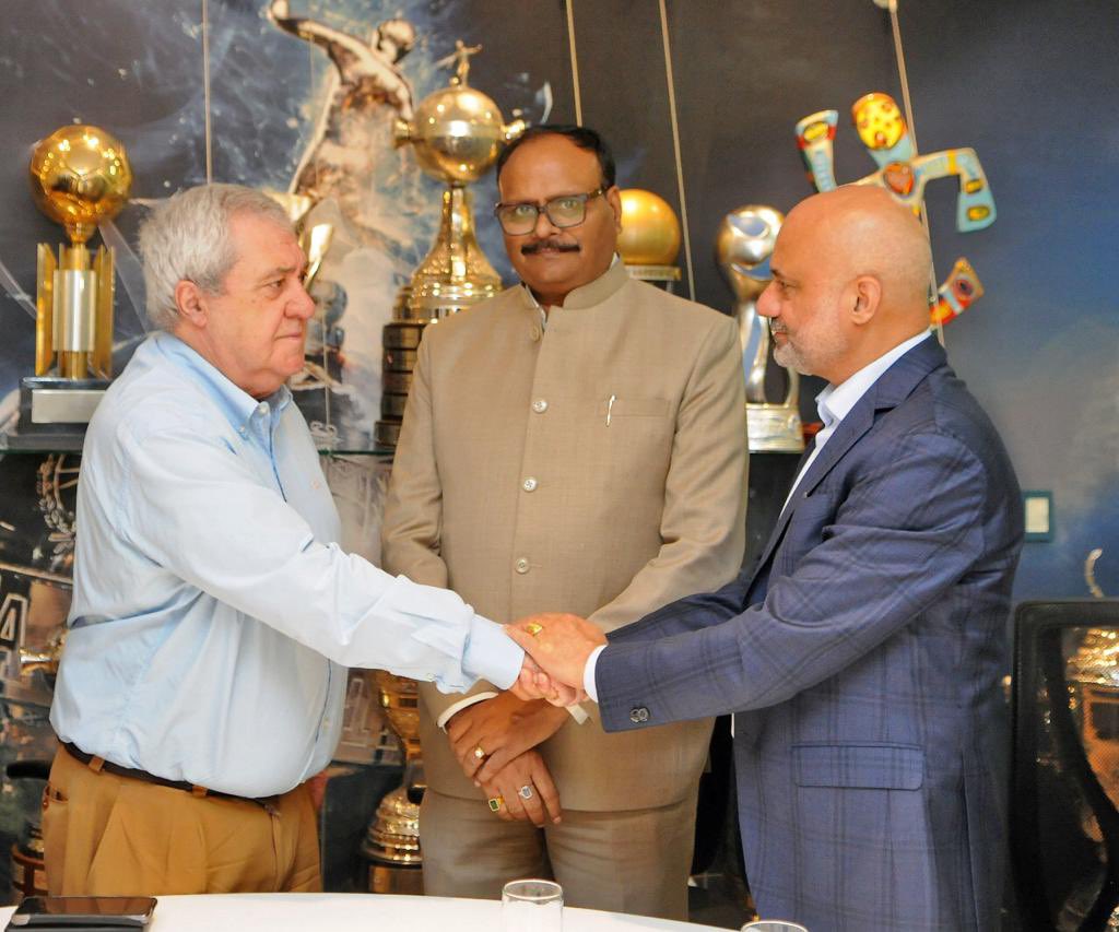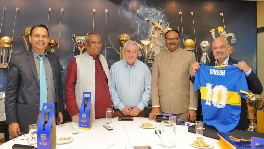 Deputy CM Brajesh Pathak and Minister of Fisheries Dr. Sanjay Kumar Nishad of Government of Uttar Pradesh, joined by Ambassador Dinesh Bhatia, received a warm welcome from President Jorge Amor Ameal at the iconic Bombonera Stadium of Boca Jrs.. They discussed promoting football in UP State.