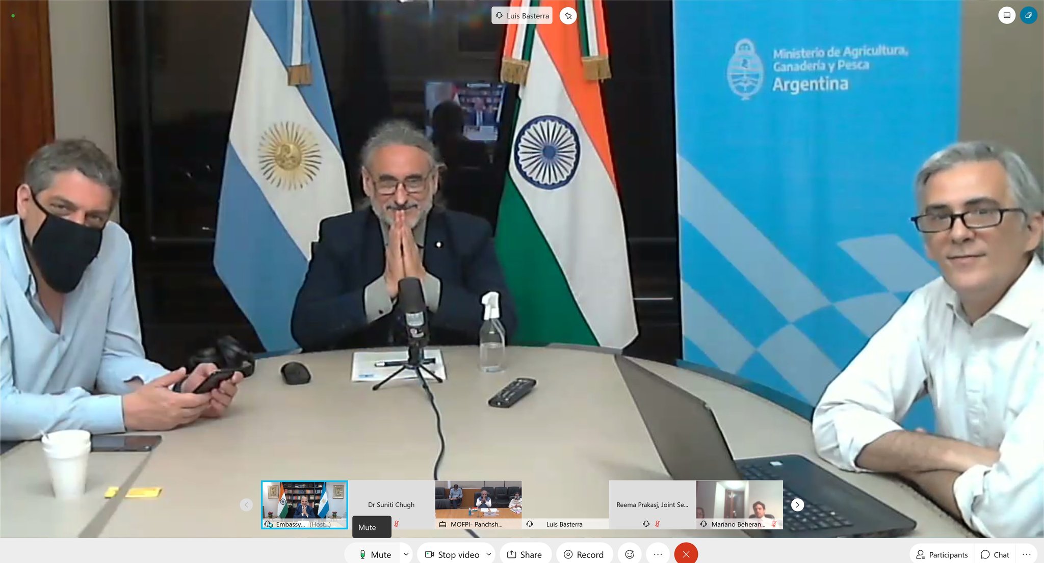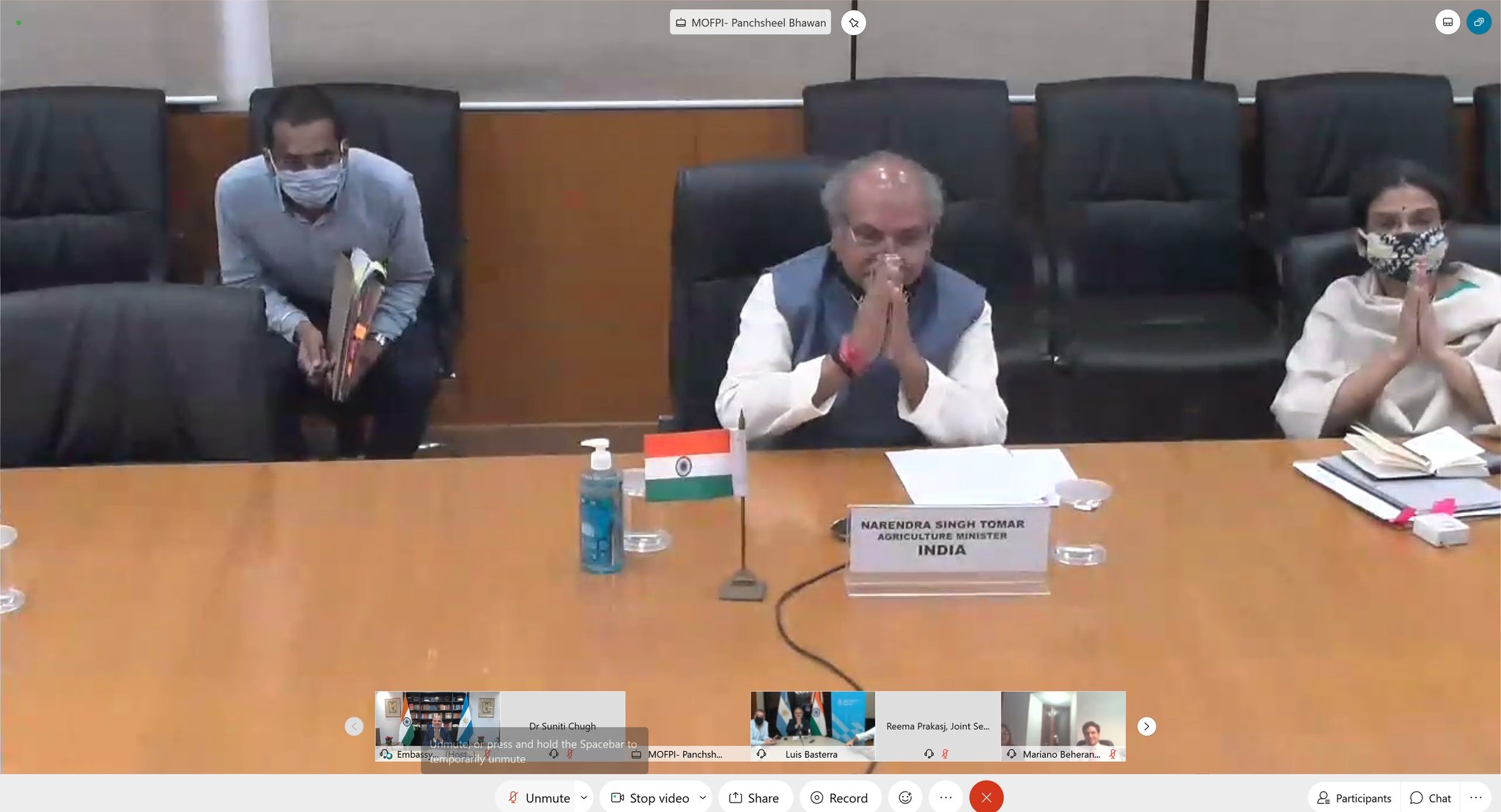 Indian Minister of Department of Agriculture, Cooperation & Farmers Welfare, Ministry of Agriculture & Farmers Welfare, HE Narendra Singh Tomar met virtually with Argentine Minister of Ministerio de Agricultura, Ganadería y Pesca HE Luis Basterra, joined by Ambassador Dinesh Bhatia, to discuss new cooperation opportunities in agriculture, fisheries, livestock and Ayurveda.