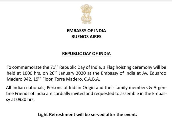 Invitation of the Embassy of India in Buenos Aires to the Republic Day.