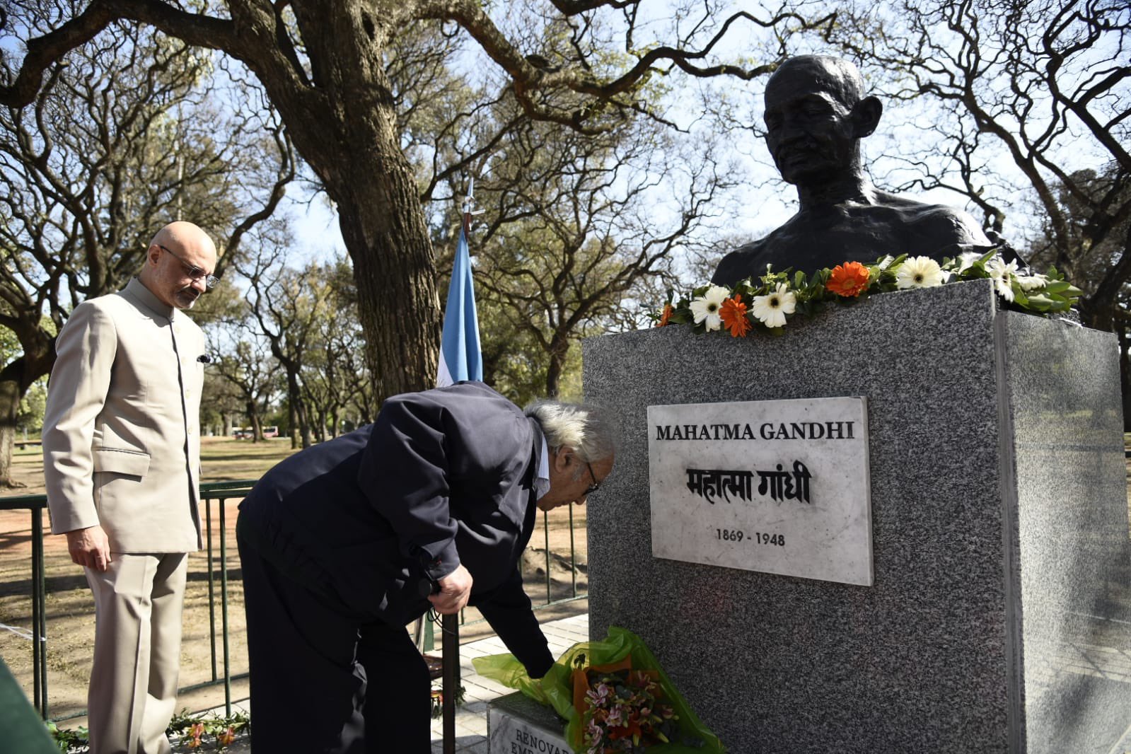 On occassion of 153rd Gandhi Jayanti, Ambassador Dinesh Bhatia together with Nobel Peace Prize Laureate Adolfo Pérez Esquivel paid floral tributes at the bust of Mahatma Gandh in Buenos Aires. Both recalled the teachings of Bapu including ideals of non-violence & truth.