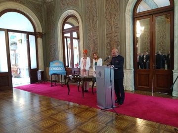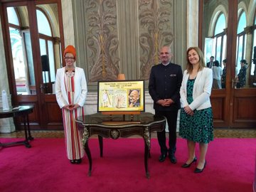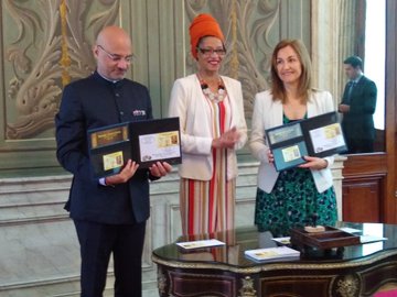 Ambassador Ana Teresa Ayala, Secretary General Ministerio de Relaciones Exteriores de Uruguay; Solange Moreira, President of Uruguayan Post Office and Ambassador Dinesh Bhatia jointly released the commemorative stamp on Mahatma Gandhi at Montevideo, Uruguay joins 70+ countries in launching  GandhiAt150 stamps.