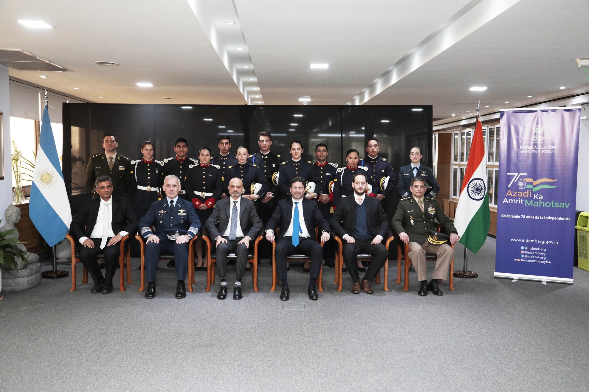 Warm send off by Ambassador Dinesh Bhatia to 12-member first-ever-youth-delegation fm Argentina comprising Argentine Air Force & Argentine Army for 76th Independence Day celebrations in India under YEP Program of Defence Ministry of India, in presence of Francisco Cafiero of Argentine Ministry of Defence.